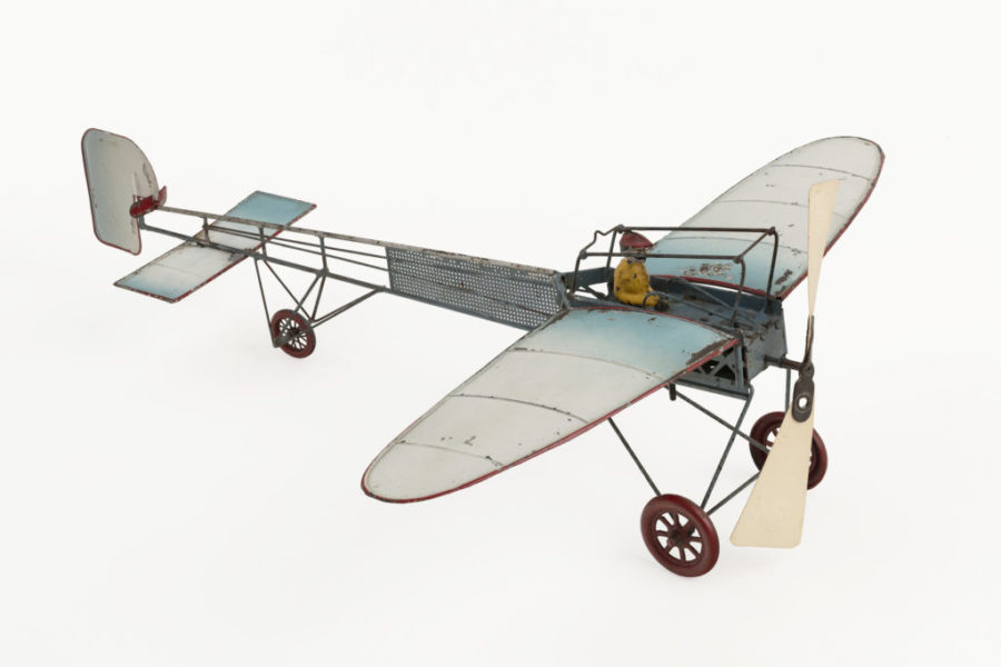 1910, une série en trois tailles différentes, avions mécaniques en tôle lithographiée et peinte qui volent au bout d’un fil ou d’un bras articulé.