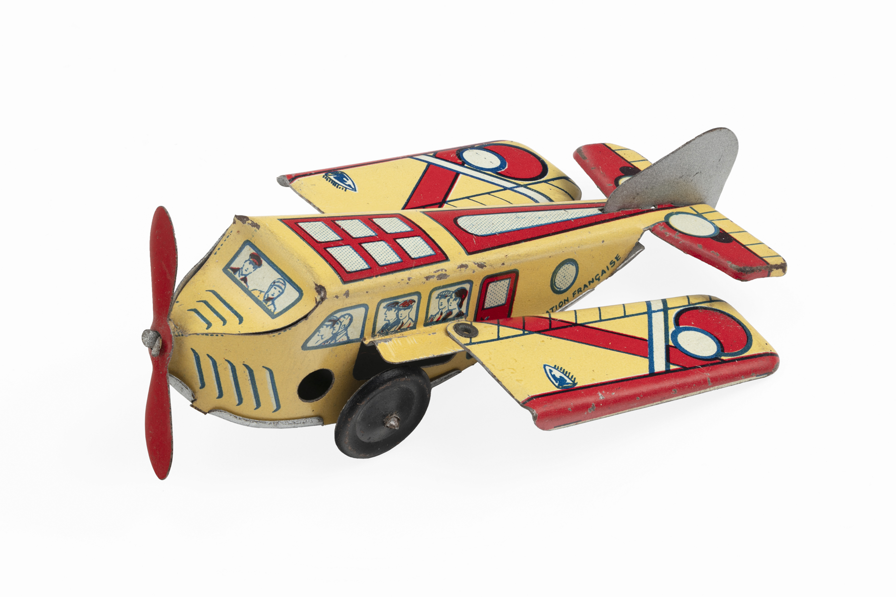 Avion de pocheMartinan & Larnaude - FranceAvionsAnnées 1930jaune/orMonomoteurMonoplanMartinan & Larnaude France 1935 Tôle lithographiée Jouet à pousser 12 x 10 cm
