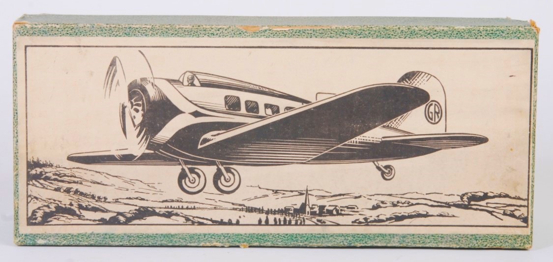 L’aéro pistoletGR - FranceJeux d’avionAnnées 1930bleuMonomoteurMonoplanGR France Milieu des années 1930 Tôle lithographiée, métal Mécanisme à ressort 28.5 x 26 cm
